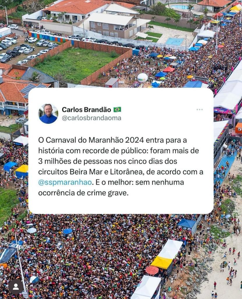 O governador Carlos Brandão usou as redes sociais para comemorar o Carnaval realizado por gestão, este ano. Segundo informou Brandão, mais de 3 milhões de foliões sem divertiram de sexta a terça-feira, nos circuitos da Beira-Mar e da Avenida Litorânea.