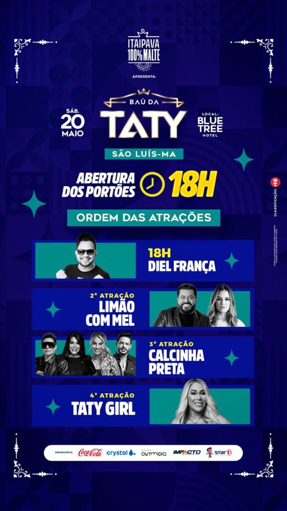 O “Baú da Taty Festival” é a grande pedida deste sábado (20), em São Luís. Sob o comando da cantora Taty Girl, o evento chega à ilha para celebrar o melhor do forró com os convidados Limão com Mel e Calcinha Preta, nos jardins do Blue Tree Hotel (Calhau).