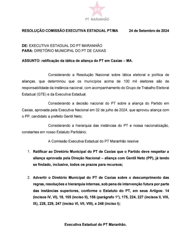 Além de reiterar a aliança, a Comissão Estadual do PT no Maranhão resolveu advertir o Diretório Municipal do PT em Caxias sobre as regras, resoluções e hierarquia internas, sob pena de intervenção futura das instâncias superiores, conforme prevê o Estatuto do partido.