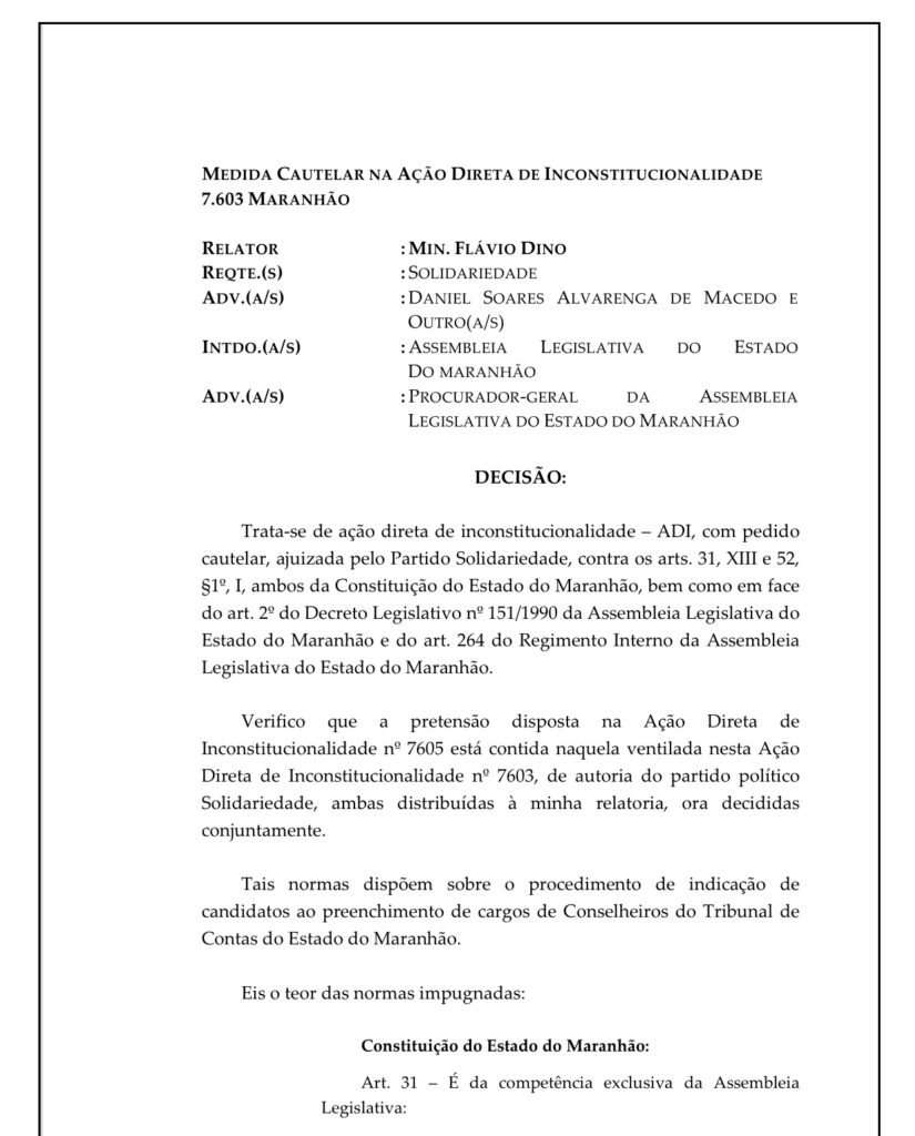 O Supremo Tribunal Federal (STF) deferiu uma medida cautelar na Ação Direta de Inconstitucionalidade (ADI) nº 7.603, movida pelo Partido Solidariedade, suspendendo temporariamente o processo de escolha de membros do Tribunal de Contas do Estado do Maranhão. A decisão, proferida pelo Ministro Relator Flávio Dino, atendeu ao pedido do partido político, que questionou dispositivos da Constituição Estadual e normas relacionadas à indicação de candidatos ao Tribunal de Contas.