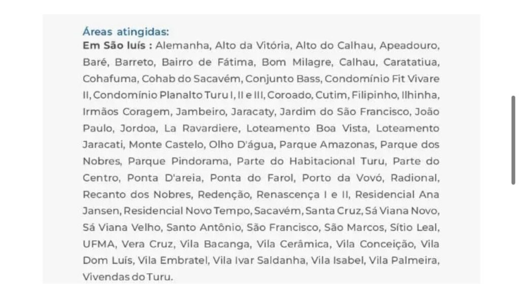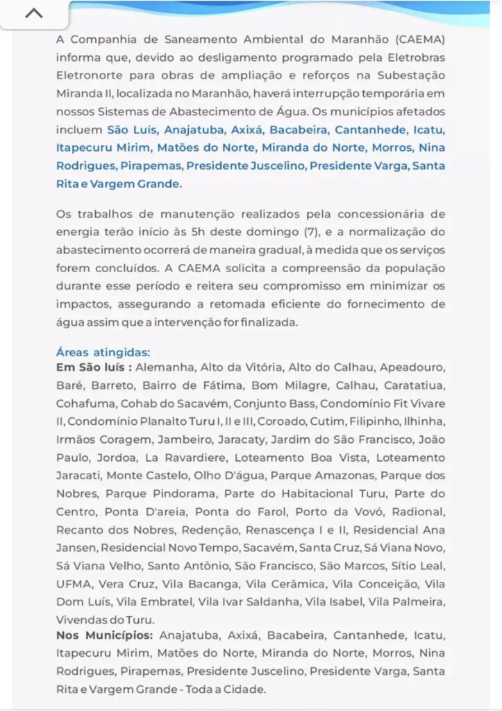 São Luís e mais dezessete municípios maranhenses serão afetados pela falta de água e energia elétrica no próximo domingo (07). A informação foi confirmada pela Companhia de Saneamento Ambiental do Maranhão (CAEMA) e pela Equatorial Energia do Maranhão.